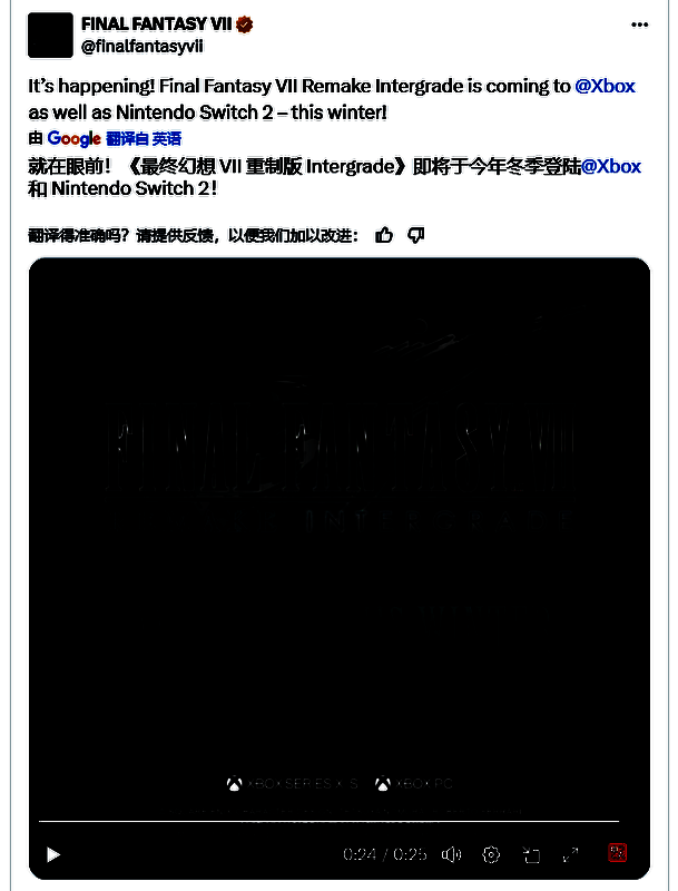 此前,在Xbox游戏展示会上,SE正式宣布《最终幻想7重制版Intergrade》今年冬季登陆Xbox平台,此前官方在预告片中仅展示了Xbox的logo,但是现在官方发推表示《最终幻想7重制版Intergrade》将同步登陆Switch2 平台,成功三大平台开花!