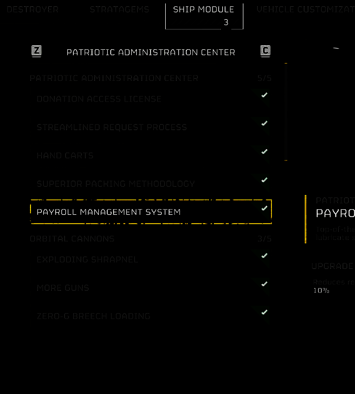 《绝地潜兵2》中的成就是非常多的,有的成就要求还比较独特,比如“火力全开”,成就的要求就是一个舰船模块提升至最高级别,基本上升级一个飞船模块上的所有东西来获得这个成就。升级船舶模块的成本需要“样品”和后来的“征用”。