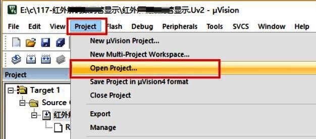 打开已写好的工程项目,可通过双击工程项目打开,也可以在keil中,菜单栏的Project-Open Project...找到项目后进行打开