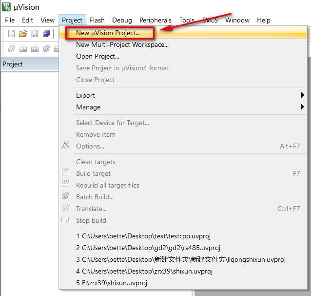 在弹出的右键菜单中我们点击new uVision Project...的选项(是创建项目的意思)