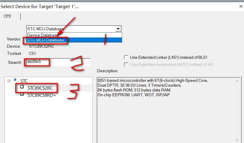 我们一般使用STC的单片机比较多,这里小编就以STC 89c52RC单片机为例子,选择STC MCU Database,然后搜索单片机的名字,再点击选中就可以了。
