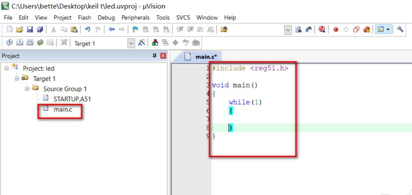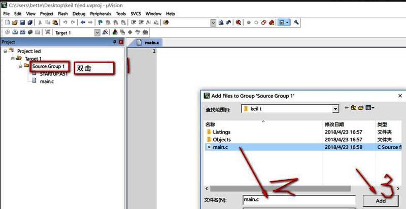 我们新建了这个main.c的文件,不过还没有导入进去,双击项目文件夹source group然后将文件添加进去