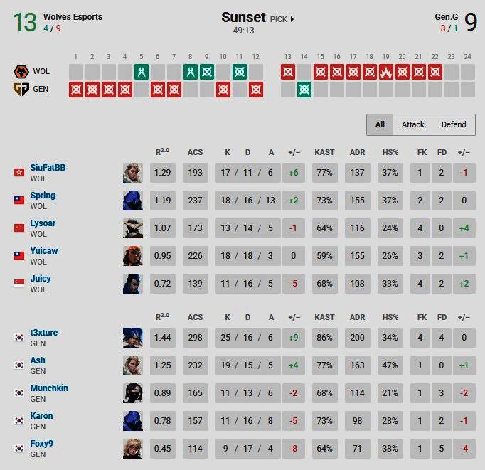 作为VCT中国赛区三号种子,狼队赛前并不被看好。但这支队伍用令人窒息的赛场表现击碎所有质疑——大胆的战术选择、无可争议的选手天赋,以及震慑全场的竞技气势,让他们成为本届赛事最大黑马。而身为VCT太平洋赛区二号种子的Gen.G,则带着2024上海大师赛冠军的荣耀卷土重来,明星阵容誓要再夺桂冠。