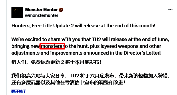 此前,卡普空发布公告预告《怪物猎人:荒野》第二弹免费更新将于6月末上线,其中包括了追加多个新怪物、武器配装等等,但是现在卡普空发布的最新的路线图中,其措辞已从复数形式的"monsters"变为单数的"additional monster",暗示怪物数量缩水剩一只,引发了部分玩家的担忧。