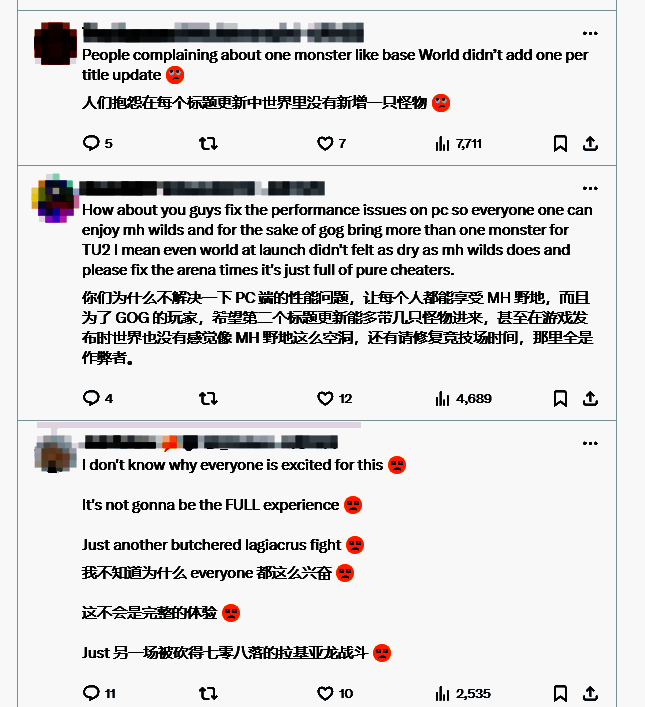 这一变动立即在玩家社区引发热议,许多人质疑卡普空的操作并表示愤怒。不过卡普空尚未就此作出回应,但部分玩家指出指出,在之前更新中,路线图同样只提到"Additional Tempered Monster",实际却新增了五只强化怪物,所以情况没有那么糟糕。