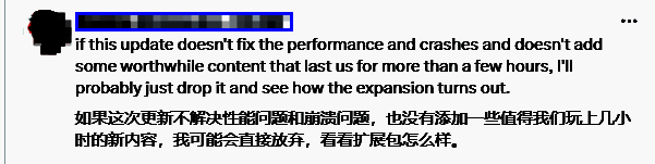 尽管如此,依旧有玩家表示:"希望第二次更新能多几只怪进来。"也有人直言:"这根本不是完整的游戏体验。",甚至有人表示:“如果这次更新不解决性能问题和崩溃问题,也没有添加一些值得我们玩上几小时的新内容,我可能会直接放弃去等DLC。”