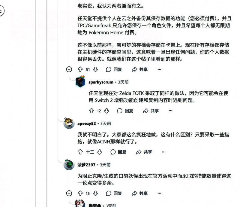 用户“IAmTheWire”评论道:“说实话,你没提前把宝可梦转进Home,责任还是在你自己。我们早就知道,Home是唯一能确保宝可梦安全的方法。如果主机坏了或数据转移失败,它们就全没了。就算没出问题,转过去再转回来也不麻烦,图个安心嘛。”