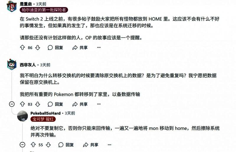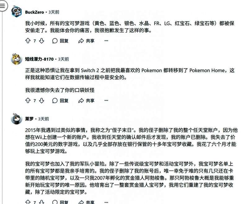 用户Mexican_Chef4307说:“我太害怕遇到这种情况了,所以在转移前把所有宝可梦都存到Home了。” TheJannikku也表示:“等我以后换Switch 2,肯定第一时间把宝可梦转进Home,不然出这种事我真的受不了。”