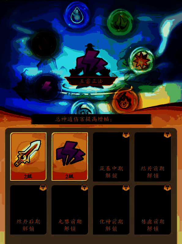 神通技能局外养成,通过消耗灵石和神通真义来提高神通等级,解锁更强力的技能效果。