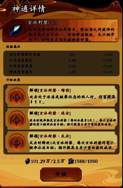 4. 玄冰封禁(水属性神通):多条件触发;技能定位偏向控制辅助,冰冻减伤。