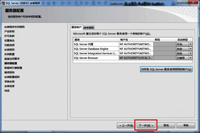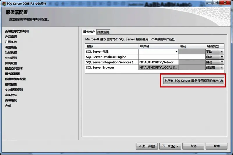 15.选择“对所有SQL Server服务使用相同的账户”,如下图所示。