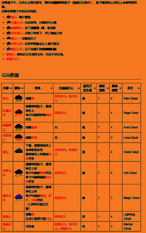 世界盒子云朵有哪些种类,世界盒子中,云朵从左到右移动,同时会播撒特殊粒子(普通白云除外),粒子落到地上/单位上会有特殊效果。游戏中有许多不同类型的云朵,下面小编为大家带来这些云朵的介绍。
