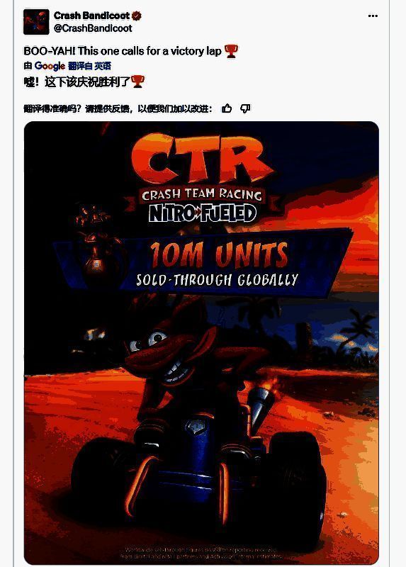 近日,发行商 Activision 和开发商 Beenox 宣布,《古惑狼赛车氮气加速》的总销量已超过 1000 万份,官方为此发文庆祝胜利,一起来看看吧!