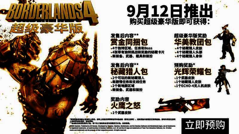 玩家只要预购《无主之地4》标准版、豪华版和超级豪华版三版本之一,就能获得预购奖励“光辉荣耀包”,其中包括一个秘藏猎人皮肤、一个武器皮肤和一个ECHO-4无人机皮肤。