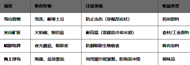 特殊作物:辉晶石花(需光照)、黑魇藤(需黑暗环境)——用于合成稀有道具或建筑升级。