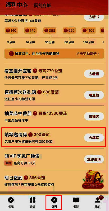 1、打开番茄小说“福利中心”,下滑界面找到“填写邀请码”,点击后面的“去填写”