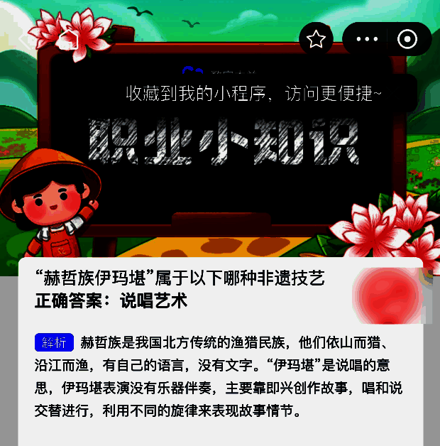 “赫哲族伊玛堪”属于以下哪种非遗技艺?这是支付宝蚂蚁新村2025年6月17日题目,每天在蚂蚁新村答题,不仅能学到有趣的职业小知识,还能提高木兰币的产速,帮助小镇建设。今天正确答案是【说唱艺术】。“伊玛堪”是说唱的意思,伊玛堪表演没有乐器伴奏,主要靠即兴创作故事,唱和说交替进行,利用不同的旋律来表现故事情节。