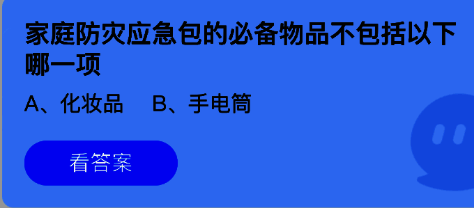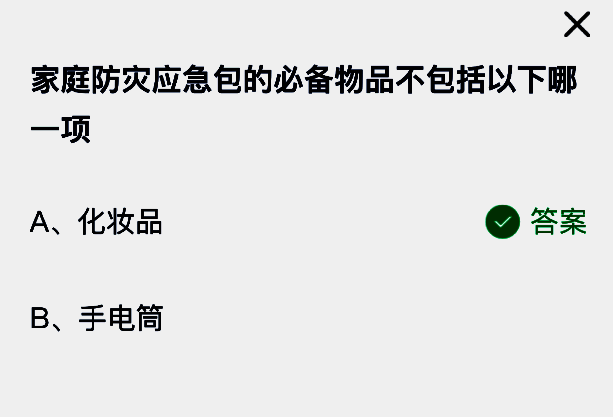 家庭防灾应急包的必备物品不包括以下哪一项?这是支付宝蚂蚁庄园小鸡答题6月18日题目,支付宝小鸡答题是大家非常喜欢的活动,大家获取饲料就可以喂养小鸡领取更多的蛋去帮助更多的人了!今日正确答案是【化妆品】,家庭防灾应急包内部采用分层储物设计,包含应急食品、医疗用品、自救工具及求救装备等四大类物资。