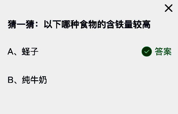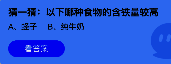 猜一猜:以下哪种食物的含铁量较高?这是支付宝蚂蚁庄园小鸡答题6月18日题目,支付宝小鸡答题是大家非常喜欢的活动,大家获取饲料就可以喂养小鸡领取更多的蛋去帮助更多的人了!今日正确答案是【蛏子】,蛏子是一种含铁丰富的海鲜,每100克蛏子的含铁量为33.6毫克,是猪里脊肉的22.4倍。