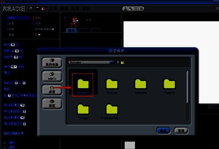 1.首先,我们打开scratch界面,点击新增角色栏目中的从文件夹选择新角色按钮