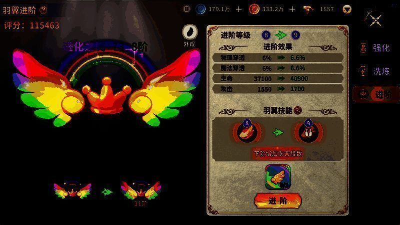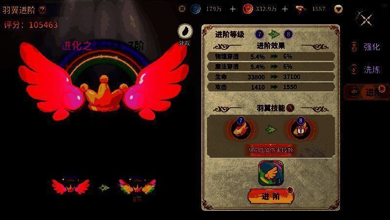 洗练:洗练有概率解锁更多的附加属性条目,并提升附加属性的品质,使羽翼的附加属性更加多样化和强大。