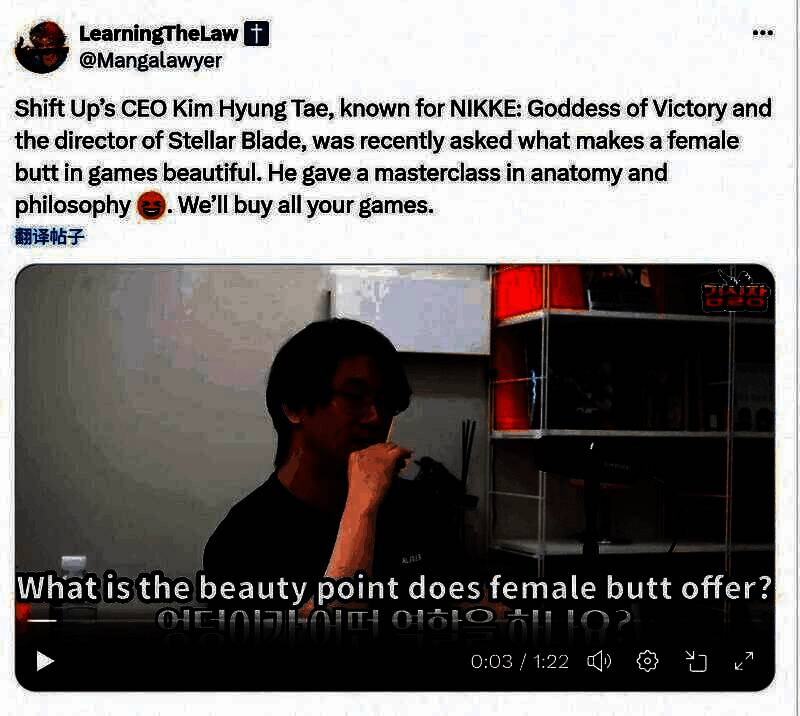 随着《剑星》PC版的火爆,玩家的热情再次被点燃,女主伊芙成为话题焦点,她那兼具力量与性感的造型设计,迅速在社群中引起了“关注”。在最近的一次采访中,《剑星》《胜利女神:NIKKE》开发商Shift Up CEO金亨泰(Kim Hyung Tae)被问到是什么让他游戏中女性的臀部如此美丽?对于这个问题,金亨泰直接给正在看直播的观众们上了一堂关于解剖学和哲学的大师课。