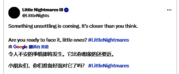 官方发文表示:“令人不安的事情即将发生,比你们想象的还要近,准备好了吗?”,很可能是在暗示《小小梦魇3》的出现。这款续作已确认推迟至今年发售,但具体发售窗口仍未公布。游戏将登陆Xbox Series X/S、PS5、PC、Switch、PS4及Xbox One平台。