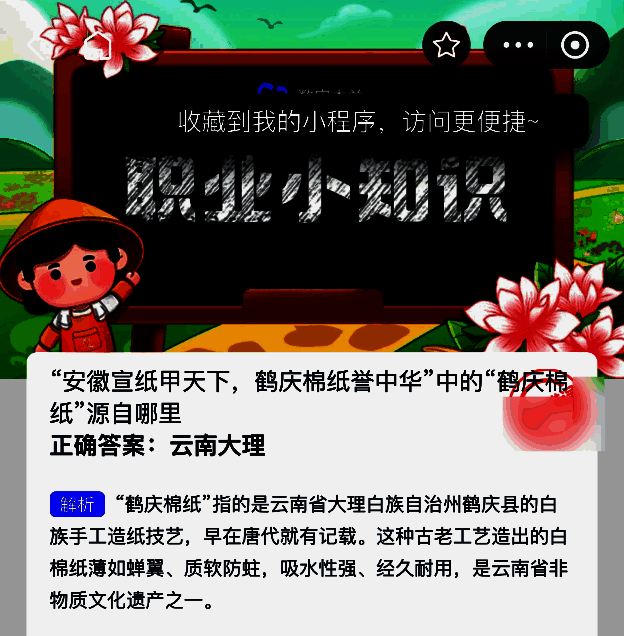 “安徽宣纸甲天下,鹤庆棉纸誉中华”中的“鹤庆棉纸”源自哪里?这是支付宝蚂蚁新村2025年6月19日题目,每天在蚂蚁新村答题,不仅能学到有趣的职业小知识,还能提高木兰币的产速,帮助小镇建设。今天正确答案是【云南大理】。“鹤庆棉纸”指的是云南省大理白族自治州鹤庆县的白族手工造纸技艺,早在唐代就有记载。