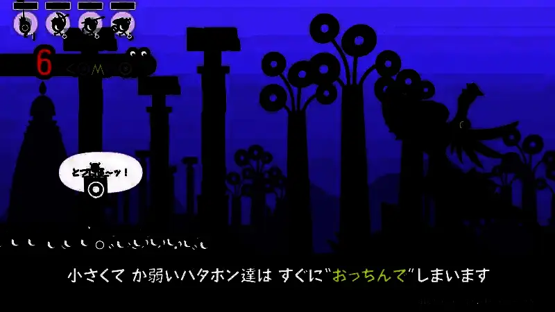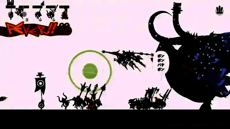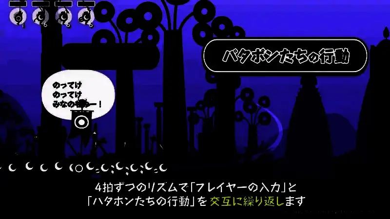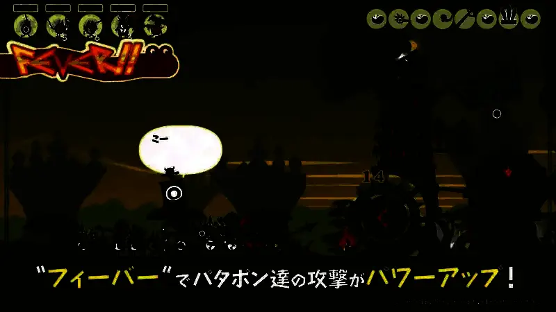 通过四个按键(对应PATA、PON、DON、CHAKA四种鼓声)输入指令,指挥PATAPON行军、攻击、防御或释放技能。精准匹配节奏可触发“Fever”状态,大幅强化部队能力。