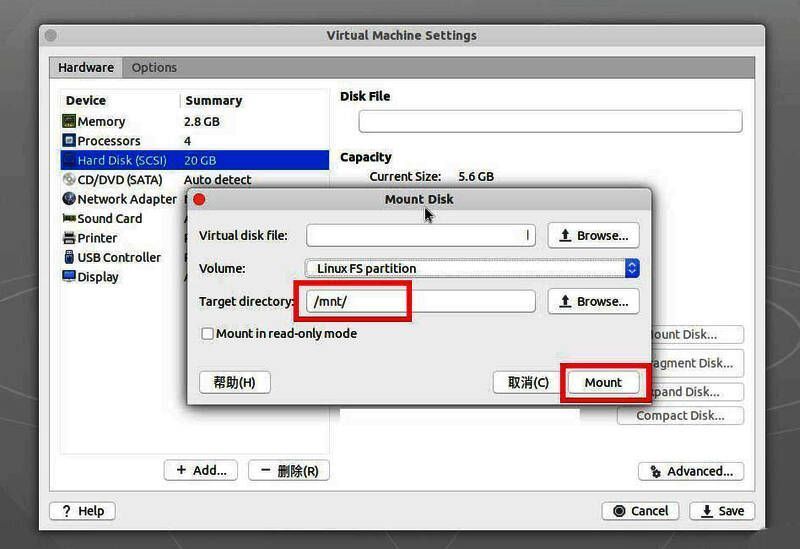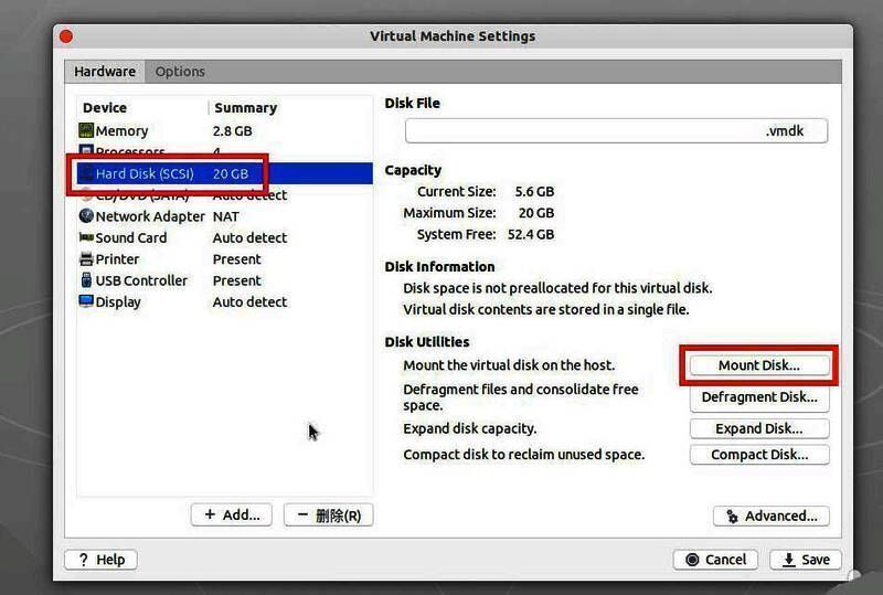 在左边的选择我们的 Hard Disk 虚拟硬盘 选项,右边选择 Mount Disk...挂载磁盘。