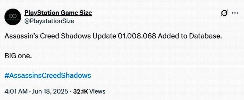 近日游戏博主PlaystationSize透露,《刺客信条:影》01.008.068版更新已被加入至PlayStation后台数据库,这将是一次“重量级更新”,或将很快发布。