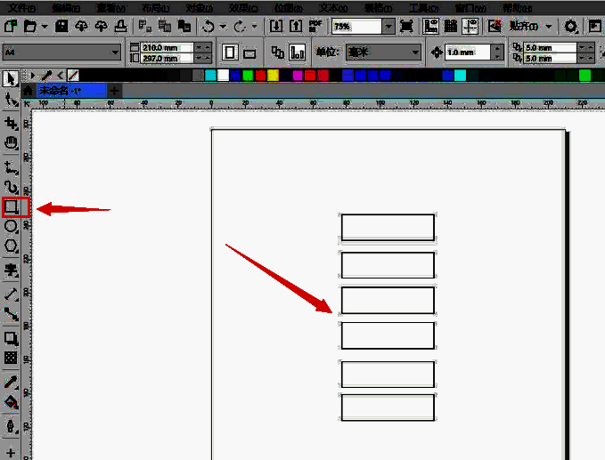 1.首先,打开CDR界面后,点击矩形工具画六个长方形