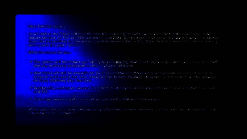 此外,自2026年1月21日起,《节奏光剑》在PS4和PS5平台上的多人游戏功能将停止支持。