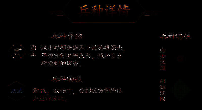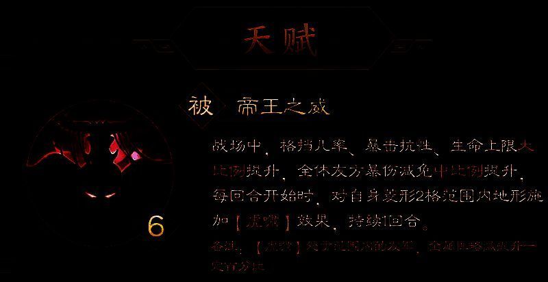 战场中,格挡几率、暴击抗性、生命上限大比例提升、全体友方暴伤减免中比例提升,每回合开台时对自身菱形2格范围内地形施加【虎啸】效果,持续1回合。