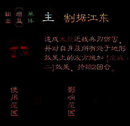 造成大量近战兵刃伤害并对自身及所有处于地形效果上的友方施加【虎威·二】效果,持续2回合。