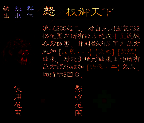 消耗200怒气对自身周围菱形2格范围内所有敌方造成中量近战兵刃伤害,并对影响范围内敌方施加【弱袭·二】【流血】【焚烧】效果,对处于地形效果上的所有敌方额外施加【弱袭·二】效果,均持续3回合,