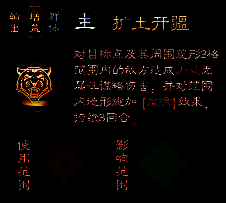 对目标,点及其周围菱形3格范围内的敌方造成少量无属性谋略伤害,并对范围内地形施加【虎啸】效果持续3回合