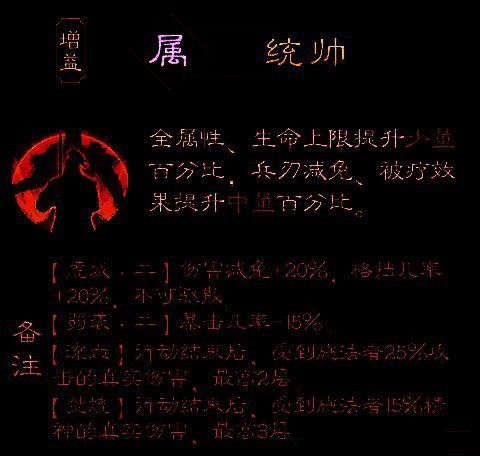 备注:【虎啸】处于范围内的友军,全属性略溦提升一定百分比。