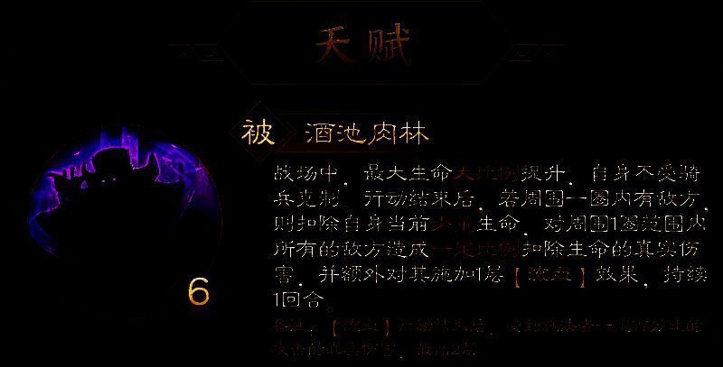 战场中。最大生命大比例提升、自身不受骑兵克制。行动结束后、若周围一圈内有敌方则扣除自身当前少量生命、对周围1圈范围内所有的敌方造成一定比例扣除生命的真实伤害,并额外对其施加1层【流血】效果,持续1回合。