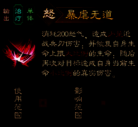 消耗200怒气。造成少量近战兵刃伤害,并恢复自身生命上限大比例的生命;随后再次对目标造成自身当前生命小比例的真实伤害
