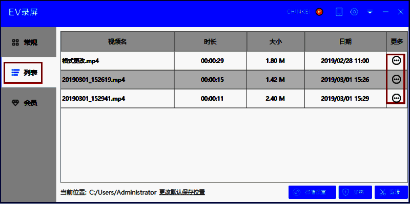 点击【列表】打开视频列表,双击视频文件即可播放视频;点击三个点按钮打开保存目录查看文件;点‘文件位置’可快速定位到文件在电脑的哪个位置。