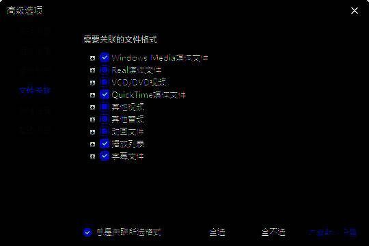 接着我们在高级选项的界面中,有众多设置选项供用户选择,在左边一栏中选择点击“文件关联”选项,因为如果打不开某个特定的视频文件,最大的可能是关联文件格式出现了问题,所以需要先进入到关联文件的格式设置中,点击其中的“其他视频”选项,如下图所示: