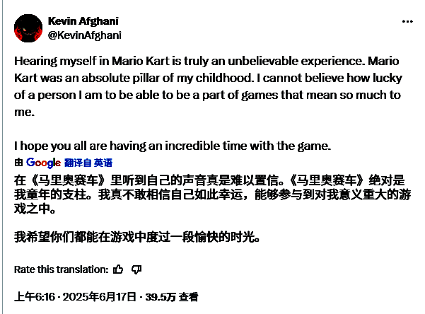 阿富汗尼近日在社交平台分享了为游戏配音的感悟:"在《马里奥赛车:世界》里听到自己的声音真是难以置信的体验,这个系列曾是我童年重要支柱。如今能参与这些对我意义非凡的游戏,我深感幸运"。文末他暖心致谢玩家:"希望大家玩得开心!"
