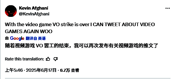 此次发声正值美国演员工会SAG-AFTRA结束针对游戏公司长达一年的罢工。阿富汗尼难掩兴奋:"游戏配音罢工结束了,我终于又可以畅谈游戏作品啦!"