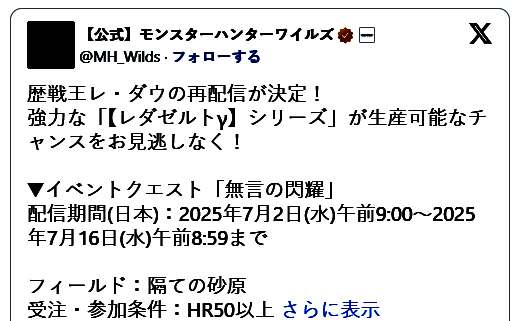 卡普空今天宣布,备受玩家欢迎的新狩猎事件将于7月2日开启,为期两周,强大的历战王煌雷龙再度君临荒野世界,强力煌雷龙γ防具生产解锁,敬请期待。