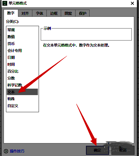 4、在格式页面,点击【数字】,选择【文本】点击确定;