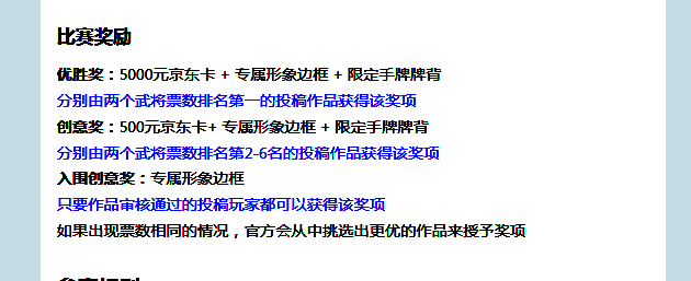 在比赛之后,玩家就可以有机会获得奖励,优胜奖是5000元的京东卡,限定的手牌牌背,还有专属的形象框。创意奖是500元的京东卡,还有专属的形象边框。还有一个入围的创意奖是一个专属的形象边框,只要是作品通过审核,所有的玩家都可以获取。