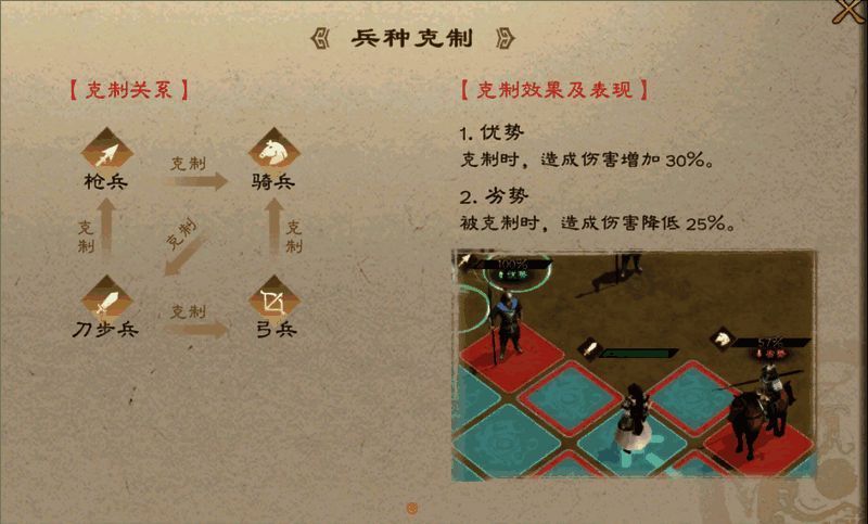 具有克制关系的兵种,克制对手时,我方造成的伤害增加30%;被对手克制时,我方造成的伤害降低25%。如:关羽为重骑兵、吕布为山地骑兵、孙策为轻骑兵;他们都属于骑兵,克制刀步兵,但被枪兵克制;当他们打刀步兵时,伤害会提升30%;但打枪兵时,伤害会降低25%。