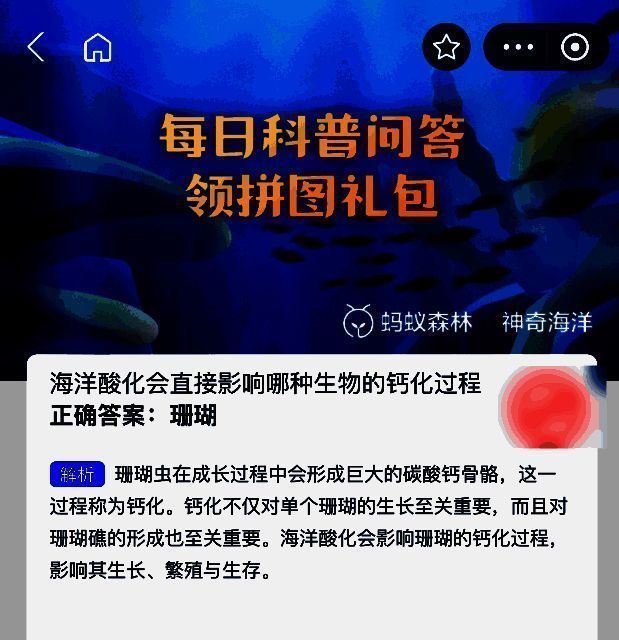 支付宝蚂蚁森林神奇海洋2025年6月18日问题已经更新,今日题目是:海洋酸化会直接影响哪种生物的钙化过程?正确答案是:【珊瑚】。珊瑚虫在成长过程中会形成巨大的碳酸钙骨骼,这一过程称为钙化。