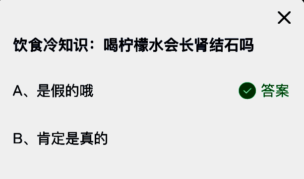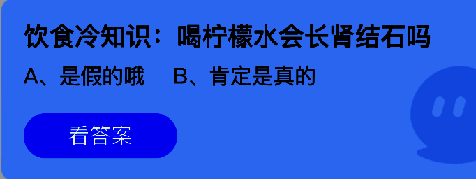 饮食冷知识:喝柠檬水会长肾结石吗?这是支付宝蚂蚁庄园小鸡答题6月19日题目,支付宝小鸡答题是大家非常喜欢的活动,大家获取饲料就可以喂养小鸡领取更多的蛋去帮助更多的人了!今日正确答案是【是假的哦】,喝了柠檬水不会得肾结石,反而柠檬水有可能对某些肾结石,特别是小的肾结石有一些预防治疗作用。